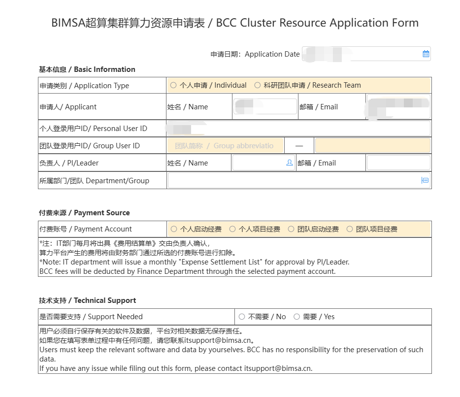 1. 若您个人使用BCC,请选择个人申请;若您的学生需要使用BCC,请选择科研团队申请。